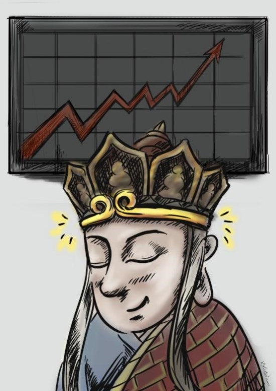 賞析:作品緊扣人物性格特點,愛念經(jīng)的唐僧給自己戴上緊箍咒,巧妙彰顯理性投資理念。